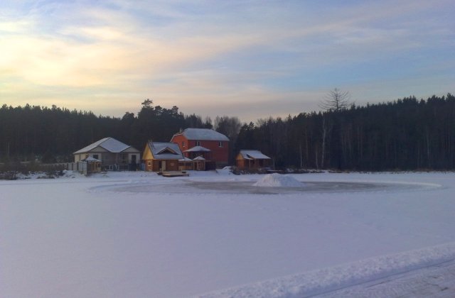 Русская баня с прорубью: парилка, комната отдыха, комната отдыха на втором этаже с обзором на озеро (для летнего времени).