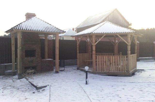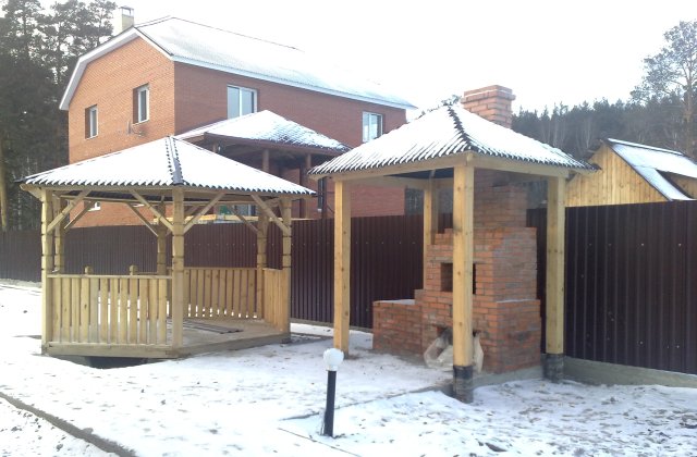 Огражденная территория разделена на две части, на каждой из которой находятся: стоянка для автомобилей, мангальные зоны и беседки.