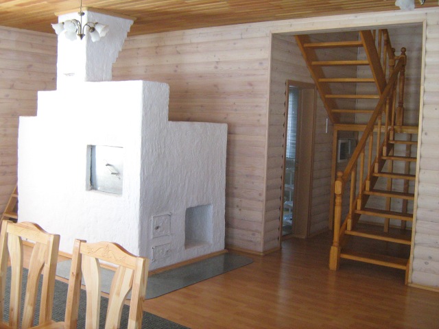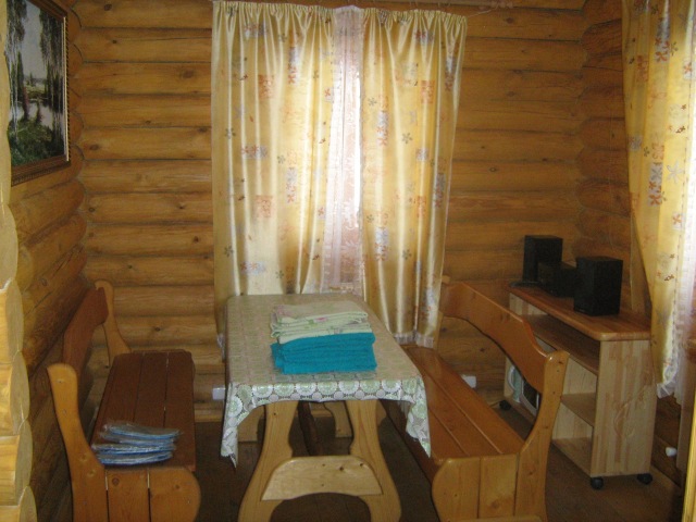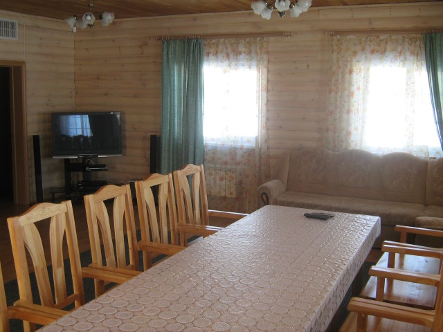 На первом этаже расположено удобное помещение для застолья с большим столом, также есть домашний кинотеатр, караоке, диван-кровать, телевизор с диагональю 115 см, удобная зона для приготовления пищи оборудованная микроволновой печью, электрическим чайником и холодильником, санузел с ванной-джакузи. Площадь первого этажа составляет 70 кв. м. На втором этаже находится три спальни, санузел с душевой кабинкой, балкон. Гостевой домик оформлен максимально качественно, все продумано и очень удобно.