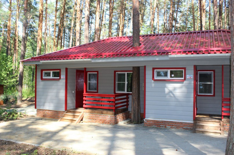 - Домики с удобствами: Лесника до 8 человек, Дом с камином до 6 человек, 2 дома Близнецы на 4 номера четырехместных каждый, Отдыха до 4 человек В этих домиках есть санузел и кухня с плитой, холодильником, столом и стульями, раковиной. В комнатах двуспальные кровати и в зависимости от типа домика двухъярусная, кресло-кровать, раскладные диваны, телевизор.