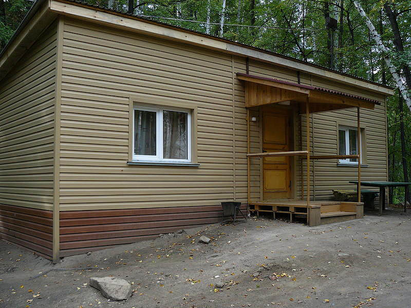 Семейный домик на две комнаты является одноэтажным отдельно стоящим коттеджем, в спальне которого стоят две односпальные кровати с платяным шкафом. А комната оснащена телевизором, раскладным диваном и шкафом. Все необходимое есть: холодильник с электрочайником, умывальник с санузлом. Есть холодная и горячая вода. В нем могут проживать четыре человека.