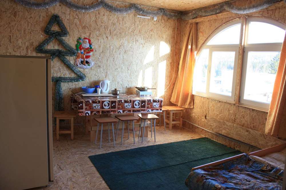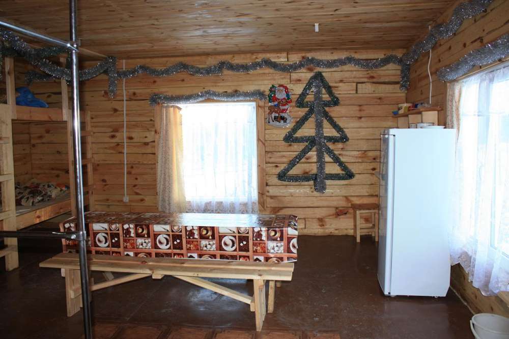 - Шестиместный дом эконом-класса отапливаемый дровами в холодное время года оснащен прихожей, обеденно-кухонной зоной, в которой есть электрическая плита, электрический чайник, посуда. Удобства расположены на территории базы, недалеко от домика. Во дворе дома есть специальная зона с мангалом, скамейками и навесом, каменным очагом, качелями.