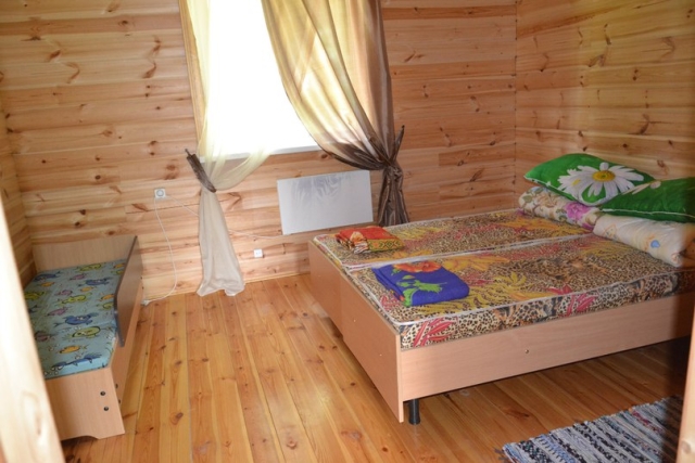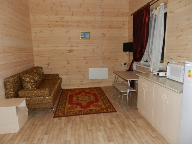 - Коттедж №6 представляет собой одноэтажный деревянный дом, рассчитанный на 4 двухместных номера, площадь каждого составляет 20 м кв. Вход для каждого номера отдельный, как и веранда. В номерах есть прихожая, душевая кабина с санузлом, раскладной двухместный диван, телевизор, а также кухонный стол с табуретами, холодильник, микроволновая печь, плита, чайник и всея необходимая посуда. В домике есть горячая вода и отопление. Есть возможность заказа 1 дополнительного места.
