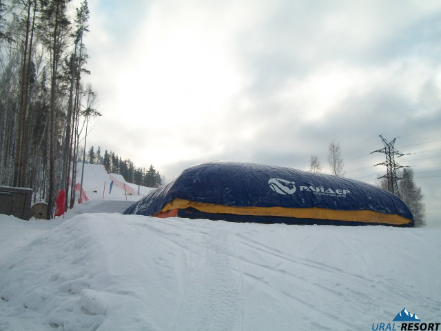 «Сноу-парк», состоит из серии учебных трамплинов, перил, рейл, квотер-пайпа и пневмо-подушки AIR-BAG для отработки трюков.