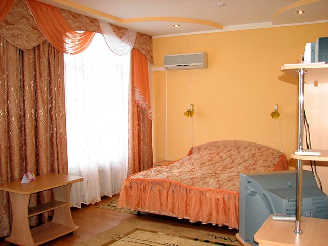 Номера категории Стандарт – однокомнатные, двухместные и трехместные, а также двухкомнатные (односпальные кровати, санузел в номере, холодильник, телевизор, фен).