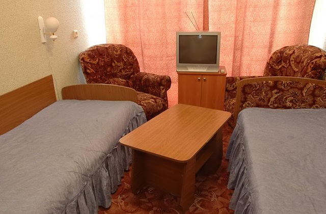 Номер «Полулюкс» – одно- или двухместный (санузел, душ, телевизор, холодильник, мягкая мебель, платяной шкаф).