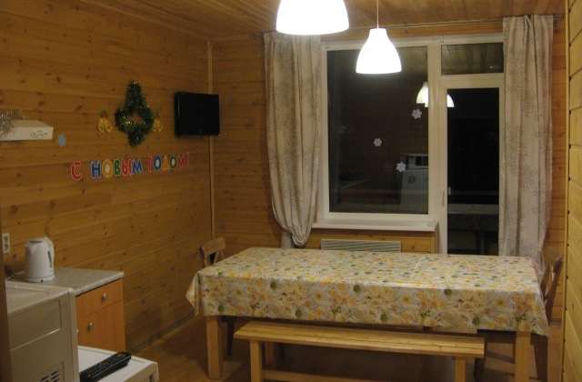 Вторая половина. (до 8 человек)Первый этаж – Спальня (2 односпальные кровать), кухня (варочная поверхность, микроволновая печь, холодильник) с обеденной зоной и телевизором, туалет с душевой кабиной. Выход на балкон.