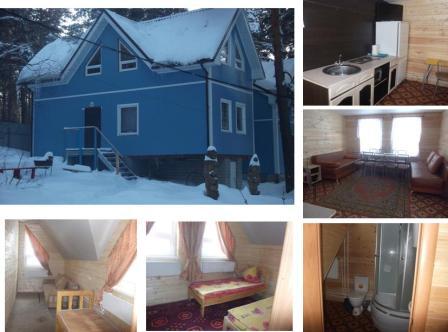 - Большой двухэтажный коттедж расчитан на проживание 20-30 гостей. На первом этаже располагается зал для банкетов с барной стойкой и маленькой кухонной зоной, а на втором есть бильярд и мансарда. Коттедж оснащен пятью спальнями. Есть также телевизор, музыкальный центр, тремя санузлами и душем.