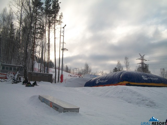 «Сноу-парк», состоит из серии учебных трамплинов, перил, рейл, квотер-пайпа и пневмо-подушки AIR-BAG для отработки трюков.